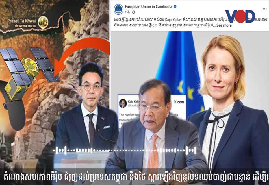 តំណាងសហភាពអឺរ៉ុប ជំរុញដល់ប្រទេសកម្ពុជា និងថៃ ស្តារឡើងវិញនូវបទឈប់បាញ់ជាបន្ទាន់ ដើម្បីជៀសវាងការរាលដាលជម្លោះកាន់តែធ្ងន់ធ្ងរ ហើយសន្យាផ្តល់នូវរូបភាពពីផ្កាយរណប សម្រាប់ឃ្លាំមើលបទឈប់បាញ់។